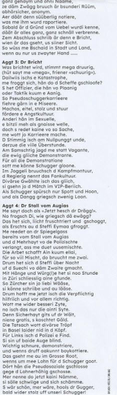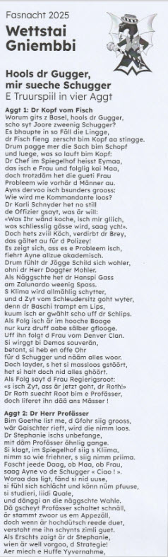 Wettstai Gniembbi Fasnachtsbricht 2025 Nr. 01 Jä nu, do die längscht Zyt, sich uff e Whats App Uffrueff vo dr WB Redaggzioon niemerts gmäldet het, zum e Wettstai Gniembbi Fasnachtsbricht zschryybe, versuech ychs! Noochdäms fümpf Joor kai Alti Garde me gää het, erlaub ych mir dä zverfasse, aaber e weeneli kritisch!!! Am Mäntig sinn mr wie allewyyl an dr Yysegass – ändlig wiider mit alle drei Ainhaite, Knorzi, Stamm und Gniembbi – yygstande. Mit em letschte Schlaag vom Martinskirchli het dr Adi sekundegenau dr „Morgestraich voorwärts Marsch“ aagsait! No zwai gmainsaame Umgäng sinn mr ellai, aaber nit verlasse unterwägs gsi. Drotz e baar Granggetsuusfäll by de Pfyffer, hänn sogar d Dambuure gloobt, dass es guet döönt haig. S Zmoorge mit ere groosse Uuswaal hänn mr wiider im Hotel Radison gnosse. Drotz em Rääge het dr harti Käärn dr Morgestraich seer lang uusglääbt. Am Nomidaag voor em Cortège isch me sich no im Käller by dr VKB Alti Garde go verköschtige. Denn isch me am Claragraabe in die usseri Route vom Cortège Richtig Wettstaiblatz yygfädlet. Unser Sujet het „Hools dr Gugger - mir sueche Schugger“ ghaisse. S isch vom e ghaimnisvolle Väärslibrünsler als Druurspiil in vier Äggt uff e Zeedel druggt und dur e Voordraab verdailt woorde. Dr Voordraab isch als Staatsdiener in blauer Uniform mit em alte Güpfihelm unterwägs gsi. Uff däm Helm und an de Jagge vom ganze Spiil, isch s neue Gniembbi-Signet aabrocht gsi. Dr goossartig Dambuurmajoorisch als Juschtizdiräggtere Stephanie Eymaa uff eme Junterössli gritte und het im Spiil dr Thaggt aagää. S Spiil het in seer häälgriene Jagge mit bruune Hoose und wysse Sogge als Jeeger, wo Schugger sueche, dr Zuug dominiert. An de uff alte Larve montierte Fääldstächer, wo uff em Broobe-fasnächtler Florian sym 3D-Drugger entstande sinn, het mes aagsee, dass do wirgligg Personaal gsuecht wiird. Dr bescht Uusbligg zum sueche het dr Schlutti uff em Hochsitz oobe vom Reggwisyt kaa. Är het sicher e Huffe z verzelle, über daas wo är alles duur sy Fääldstäächer gsee het. Die erschti Wettstai Gniembbi Ladäärne vo dr Neuzyt isch mit iirer Dreieggsform scho e weeneli gwöönigsbedürftig gsi. Dur die relativ glaine Dreieggsfläche het sich dr Kinschtler in vyyle glaine Detail verloore. D Voorder- und Ruggsytene hänn laider, dur dä underbrächendi Absatz in dr Mitti vo dr Ladäärne, an Groossflächigkait und -zügigkait yybiesst. No eppis Wichtigs, waas mr für e Süüschee hänn und wie mr haisse, hesch au nit uff e erschte Bligg uusegfunde! Im Dyychgässli hets, nooch dr Passage bym Comité an dr Clarastrooss, dr 1. Halt gää. Dr 2. Halt isch nooch dr Bruggeüberquerig scho bym Stadtkäller gsi. Drno hets e lange Marsch am Comité bym Stainebäärg verbyy, in d Aeschevoorstadt gää. Döört hann mr im Käller vo «DeVersoffeneDööcht» e längere 3. Halt, mit feyner Zwüsche-verpfläägig, gmacht. Uff die achti Zoobe sinn mr im 1. Stogg vom Bruune Mutz zämmemit em Stamm go Znacht ässe. Do gits e groosses Danggerscheen an s Baizesuech-OK zrichte. Es isch richtig gsi, dass me mit em Wirt greedet und dr Standort byybhalte het. Dr Service isch gege em Voorjoor, wie Daag und Nacht gsi. Es isch e aifachs Menue rasch, gnueg, guet und warm uffdischt woorde. Dernoo isch me noonemool uff d Gass. D Gniembbi hänn denn voor Mitternacht uffghöört. Am Zyschtig sinn d Wettstai Schysdräggzüügli, wie Popeye, Yysbääre, Zääni Club, Blaui Garde, die Schyytere und Saitespränger, underwäggs gsi. Am elfi Zoobe het me sich freiwillig zum groosse Umgang voor em Stadtkäller droffe. Laider isch dä gruusig verschifft woorde. Drum het dr grooss Huffe bym Bruune Mutz dr Abgang franzöösisch und dropfend gnoo! Am Mittwuch het wiider die groossi Stund vom Glyggehoof-Fotigraph Thomas gschlaage. An dr Yysegaas hänn sich die drei Ainhaite separaat abliechte losse. Phünggtlig am halber Zwai sinn mr uff dr innere Route über d Brugg abmarschiert. Am Claragraabe het dr Gröösse bym Comité sy gliebte Maieriislimaie griegt, wo mee im Ladäärnegraabe, als in sym Arm glääge isch. Dr 1. Halt het bym Brunne an dr Kirchgass stattgfunde. Aaschliessend het me am Wettstaiblatz wiider in Cortège yygfäädlet. Am Comité verbyy isch me oobe an dr Brugg uusgfäädlet und via Rittergass bis zum 2. Halt an d Bäumligass gloffe. Voor em hefftige Rääge hänn mr is u.a. ins ehemoolig Lufftschloss, wo jetzt Rubino haisst, gflüchdet. Dr Zuugsscheff het is denn ab dr innere uff sy aigeniRoute in d nööchi vom Seibi gfiert! Döört wär mit de Amedysli dr Apéro voorgsee gsi. Do ab dr Aesche bis zem Seibi e gröössere Gotthard-Ooschterstau gsi isch, hänn die Maischte dr Apéro verbasst. D Amedysli sinn erscht im zwaite Aalauff uff e Baarfiesserblatz yynekoo! Am säggsi Zoobe isch im 1. Stogg vom Mutz s Nachtässe uffdischt woorde. Daasmool isch kai Epfelmuess mit Höörnli und Ghaggtem serviert woorde. Für d Nit-Vegianer hets e feyne Häärd-epfelstogg mit Broote und Gmies gää. D Knorzi sinn denn no zem offerierte Dessert yydroffe. Dr Service isch, wie scho am Mäntig erwäänt, seer kundefründlig und züügig gsi. D Ladäärnezier hänn unser lyytchend Dreiegg vo dr Wysse Gass zem Dramhüüsli voorzooge. Daas het zum e Duurenand und ze Abmarschverzöögerige gfiert, will: a) dr Stamm und d Knorzi iiri Ladäärne, wie allewyyl uff em Barfiesserblatz abgstellt hänn. b) do sich d Zuugsscheffe nit abgsprooche kaa hänn, dass mr zwai Runde zämme mache, hänn die baide Lambbe ze dääre vo de Gniembbi voor e Mutz miesse ghoolt wäärde. c) wo denn die Herre Zuugsscheffe sich mit dr Stammzuugsscheffin gainigt hänn, isch me denn ändlig zämme, mit drei Lambbe dr Koolebäärg uff über e Oobere Heubäärg zur Harmonie gloffe. Nooch em längere Halt in und um d Harmonie, isch dr «long way», via Noodlebäärg, Petersgass, Bluemerain, Spiegelgass, Stadthuusgass an d Schnyydergass,draa koo. Voor em Stadtkäller, isch um die El